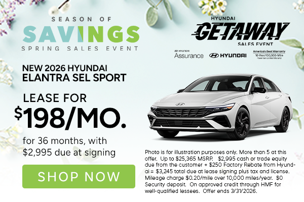 More than 5 at this offer. Up to $25,365 MSRP. $2,995 cash or trade equity due from the customer + $250 Factory Rebate from Hyundai = $3,245 total due at lease signing plus tax and license. Mileage charge $0.20/mile over 10,000 miles/year. $0 Security deposit. On approved credit through HMF for well-qualified lessees. Offer ends 3/31/2026.