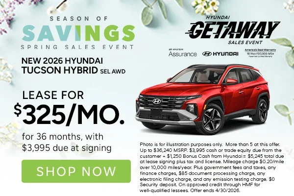 More than 5 at this offer. Up to $36,240 MSRP. $3,995 cash or trade equity due from the customer + $1,250 Bonus Cash from Hyundai = $5,245 total due at lease signing plus tax and license. Mileage charge $0.20/mile over 10,000 miles/year. Plus government fees and taxes, any finance charges, $85 document processing charge, any electronic filing charge, and any emission testing charge. $0 Security deposit. On approved credit through HMF for well-qualified lessees. Offer ends 4/30/2026.