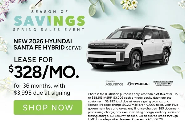 More than 5 at this offer. Up to $38,515 MSRP. $3,995 cash or trade equity due from the customer = $3,995 total due at lease signing plus tax and license. Mileage charge $0.20/mile over 10,000 miles/year. Plus government fees and taxes, any finance charges, $85 document processing charge, any electronic filing charge, and any emission testing charge. $0 Security deposit. On approved credit through HMF for well- qualified lessees. Offer ends 4/30/2026.